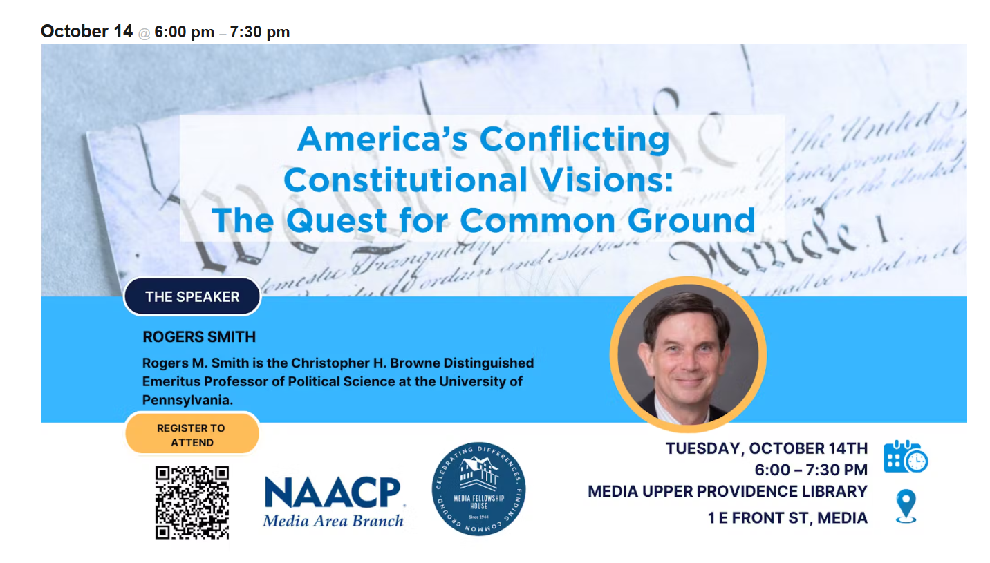Media Upper-Providence Library 1 E. Front St., MediaAmerica’s political polarization is often fueled by clashes between two rival visions of the Constitution—one traditionalist, one progressive. Yet both interpretations are deeply rooted in the Constitution itself. In this thought-provoking lecture, Rogers M. Smith—a leading scholar of American constitutional law and political thought—explores how the Reconstruction Amendments—the 13th, 14th, and 15th—embody elements of both